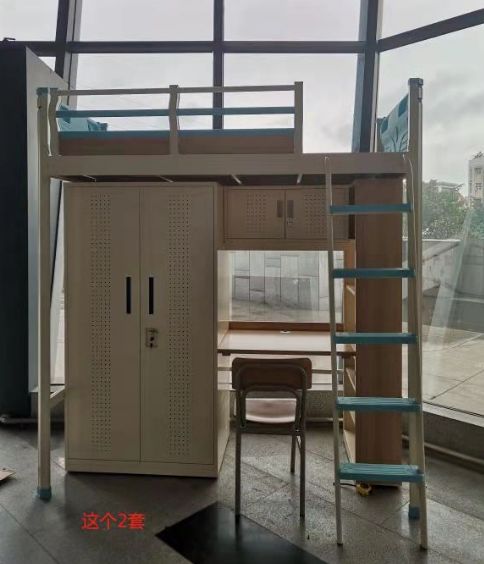 长横梁:采用102mm*41mm中空异形管,材料厚度为 1.2mm,正面有两条加强筋,底部为圆弧形设计,起到防撞作用;铺板采用单面刨光后≥13㎜厚度的杉木实木铺板,木材干燥,无大结疤,无朽木。组合柜规格(㎜):长1920×深600×高1690mm。其中:衣柜:规格1690(高)×700(宽)×600(深)mm;书柜:规格1690(高) ×1220(长)×600∕290(宽)mm;电脑桌:规格920(长)×600(宽)×760(高)mm;柜子锁采用挂锁。