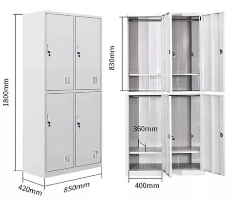 四门更衣柜,采用优质0.6冷轧钢板,静电喷涂工艺,耐腐蚀,无异味